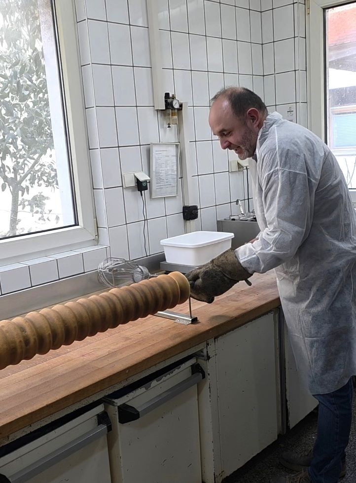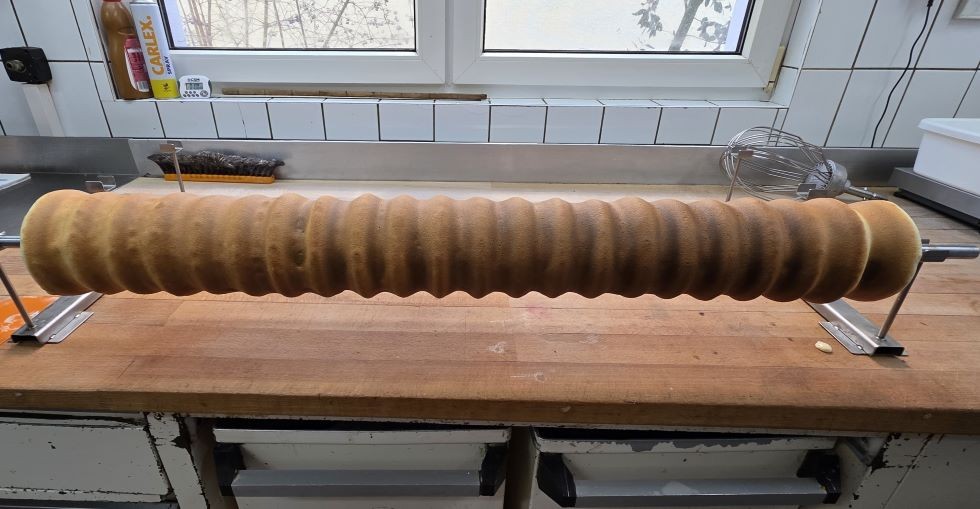 Vor Ort konnte ich Bäckermeister Herrn Rhodmann beim Backen von Baumkuchen über die Schulter schauen. Dabei wurde deutlich, mit wie viel handwerklichem Können, Erfahrung und Sorgfalt diese regionale Spezialität noch heute hergestellt wird. Jeder einzelne Arbeitsschritt erfolgt in echter Handarbeit – ein eindrucksvolles Beispiel gelebter Tradition.