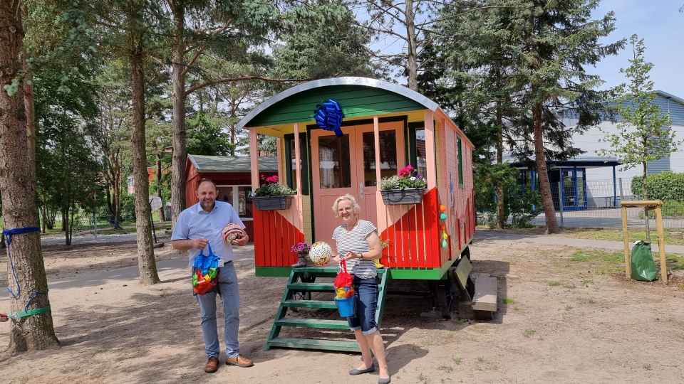 Über das kleine Gastgeschenk (Bälle und Sandkastenspielzeug) hat sich Leiterin Ivette Marquardt sehr gefreut.
